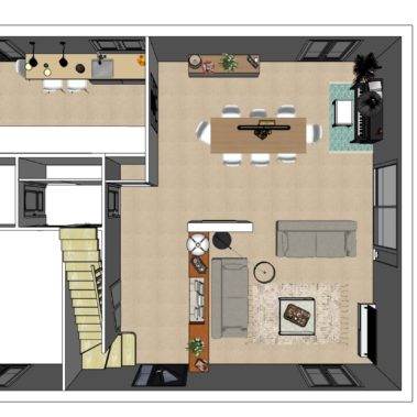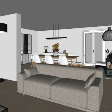 A partir du plan 2D, de photos et du cahier de tendances transmis par le client, je modélise la pièce en 3D sous sketchup.