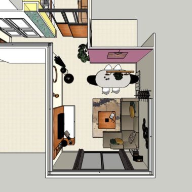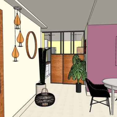 A partir du plan 2D, de photos et du cahier de tendances transmis par le client, je modélise la pièce en 3D sous sketchup.